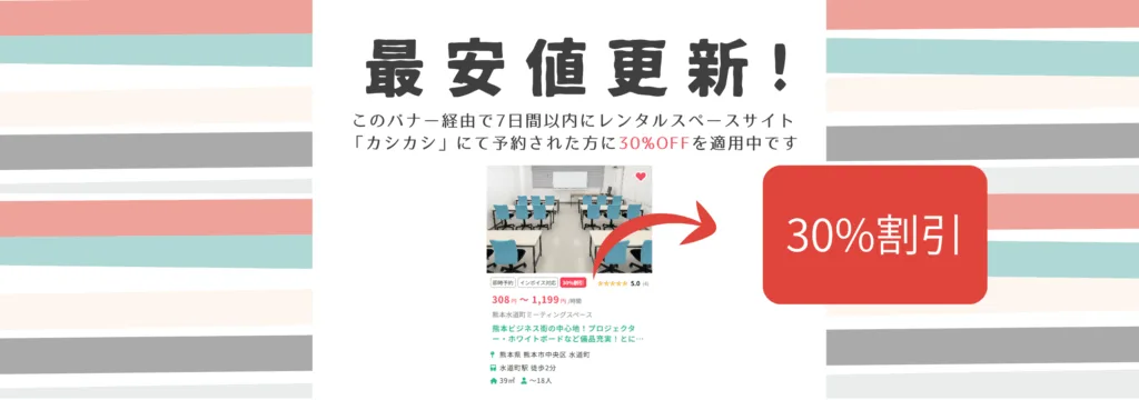 当日半額!破格の直前割が話題。熊本のビジネスの中心地!Wi-Fi 無料で18名以上座れる格安貸し会議室